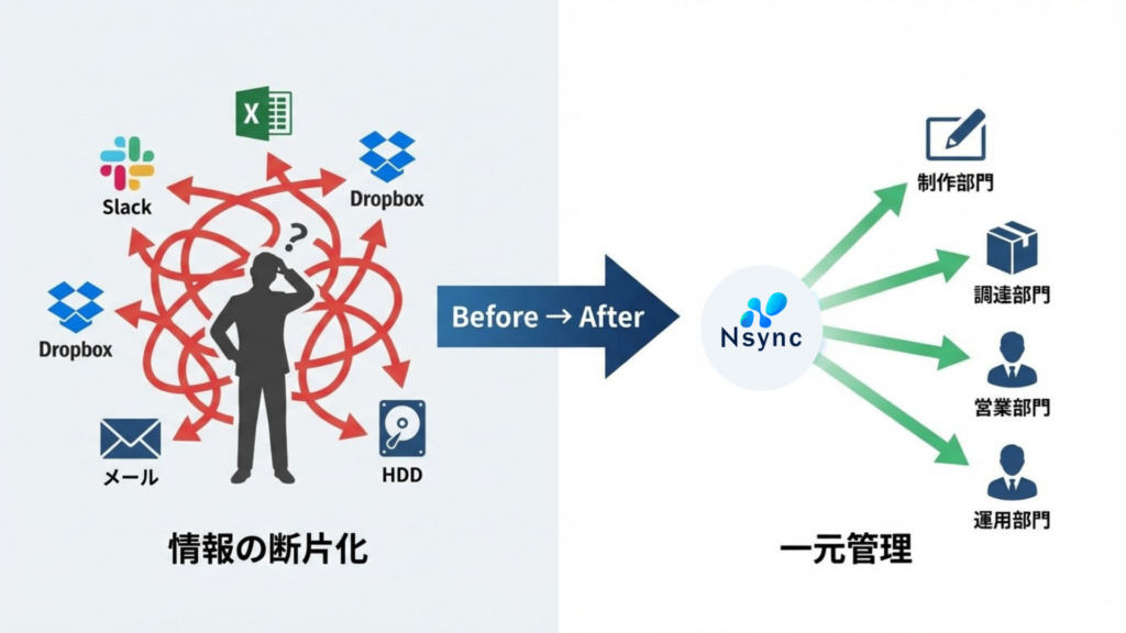 「全体の進捗表」「物理メディア管理表」「権利関係のリスト」「納品仕様チェックリスト」……。気づけば、同じ作品の名前を複数のシートに何度も入力していませんか? どれかが更新されても、もう一方が古いまま放置される。すると現場では、「結局、どの表の情報が正しいのか」「どれが最新の決定事項なのか」を裏取りするために、担当者にチャットを飛ばし、その返信を待つという無駄なコストが発生します。この「情報の断絶」を埋めるための確認作業だけで、スタッフ一人あたり月間40時間ものタイムロスが発生している。これはもはや、一人分の労働力が「確認」という名の不毛な作業に消えているのと同じです。 - Nsyncの解決策: 全情報の「完全一元化」と「自動同期」
