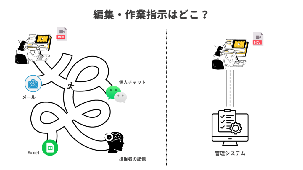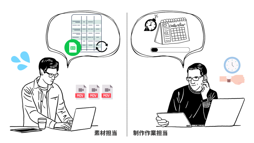 素材の受取やクオリティチェック(QC)など、担当者が責任を持って対処すべき工程は重要です。しかし、そこで得た知見を「共有」するまでのタイムラグが、チーム全体のボトルネックになります。