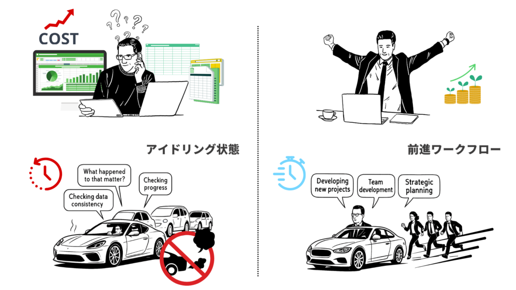 しかしより深刻なのは、金額よりも「時間の質」の問題です。新規案件の開拓、クライアントとの関係構築、チームの技術向上、次のフェーズに向けた戦略立案——こうした業務はいずれも、リーダーにしか担えない高度な判断を要するものです。それが「データの整合性を確認する」「誰がどこまで進んだかを聞いて回る」という、ツールに任せれば済む作業に置き換わっている現実は、組織にとって極めて大きな損失です。高性能なエンジンを積んだ車をずっとアイドリングさせているようなもので、燃料は減り続けるのに、チームはどこへも前進できません。