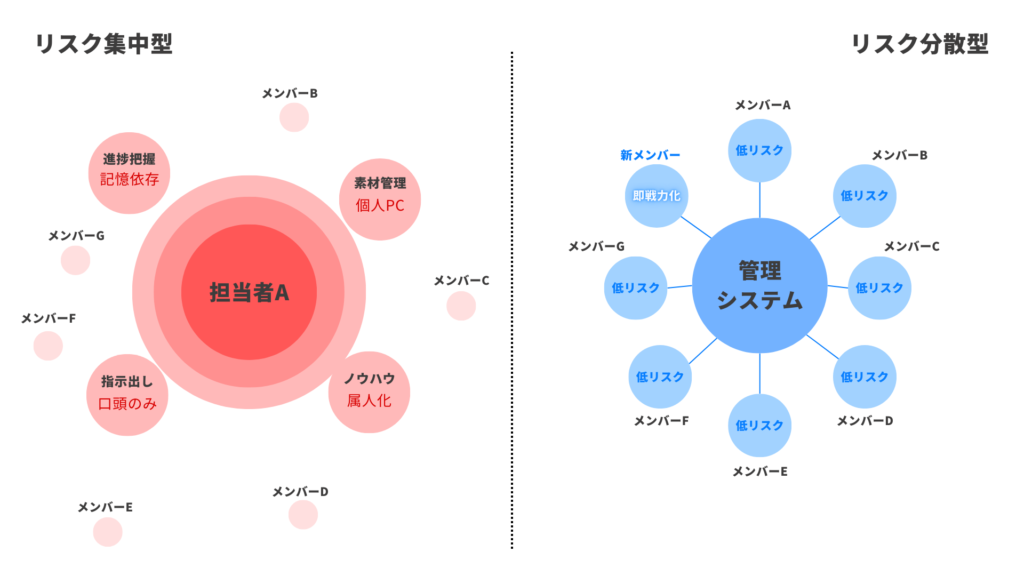 従来の管理体制が抱える最大の問題は、業務フローが属人化しているという点です。「このプロジェクトはこのシートのこのタブを見て、この列に入力して、完了したらここにチェックを入れる」——こうしたルールは、長年の現場経験の中で積み上げられた知恵の結晶です。しかし裏を返せば、「そのルールを知っている人がいなければ回らない仕組み」でもあります。担当者が異動・退職した途端に現場が混乱するのは、業務が「人」に紐づいているからに他なりません。