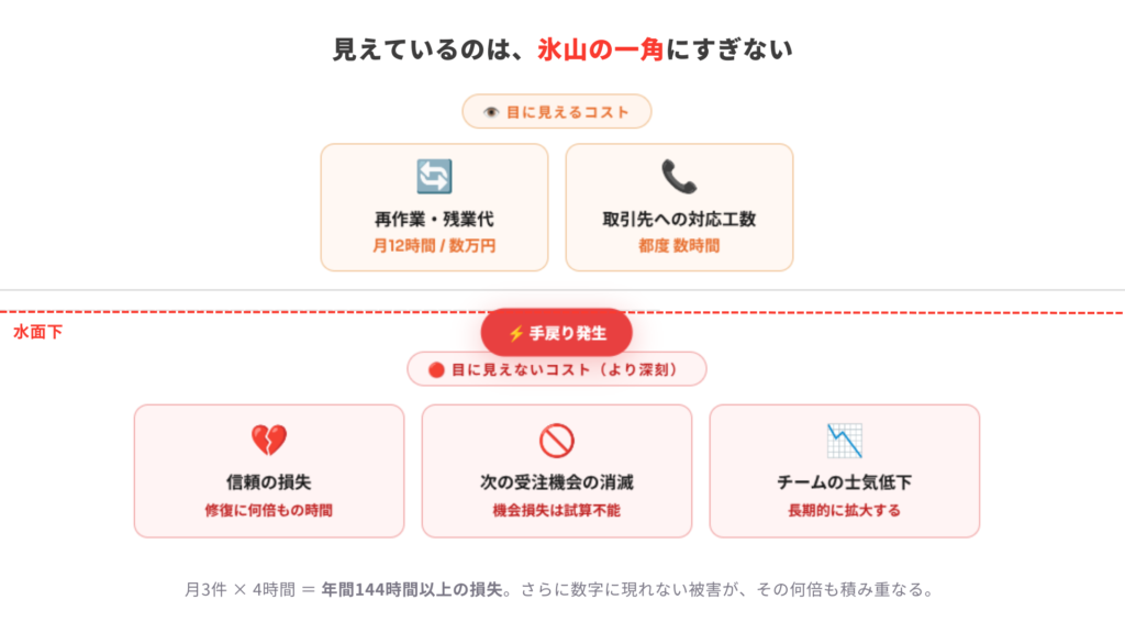 そして数字以上に見落とされがちなのが、「信頼の損失」という目に見えないコストです。「また間違えた」という印象を一度持たれると、その後の関係修復には通常業務の何倍もの時間と労力が必要になります。手戻りは利益を削るだけでなく、次の受注機会にまで影響を及ぼす、複合的なリスクなのです。